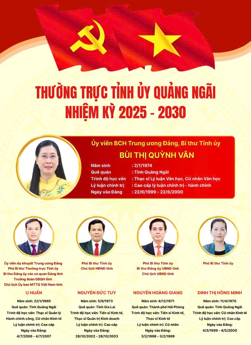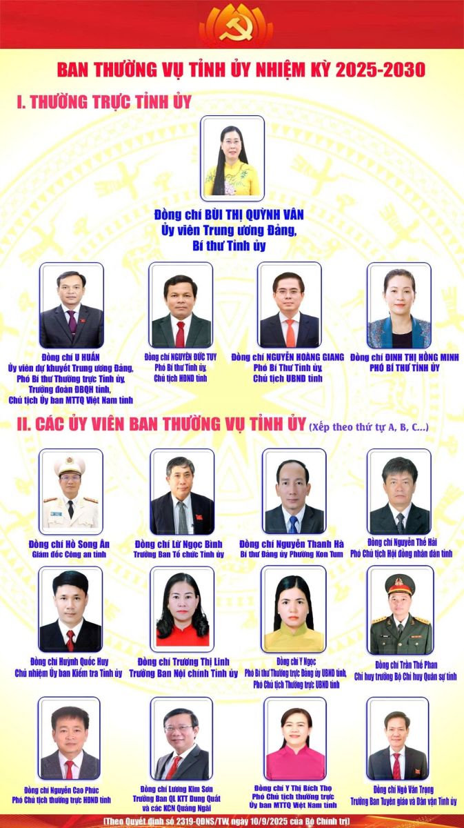 Ban Thường vụ Tỉnh ủy Quảng Ngãi nhiệm kỳ 2025 - 2030